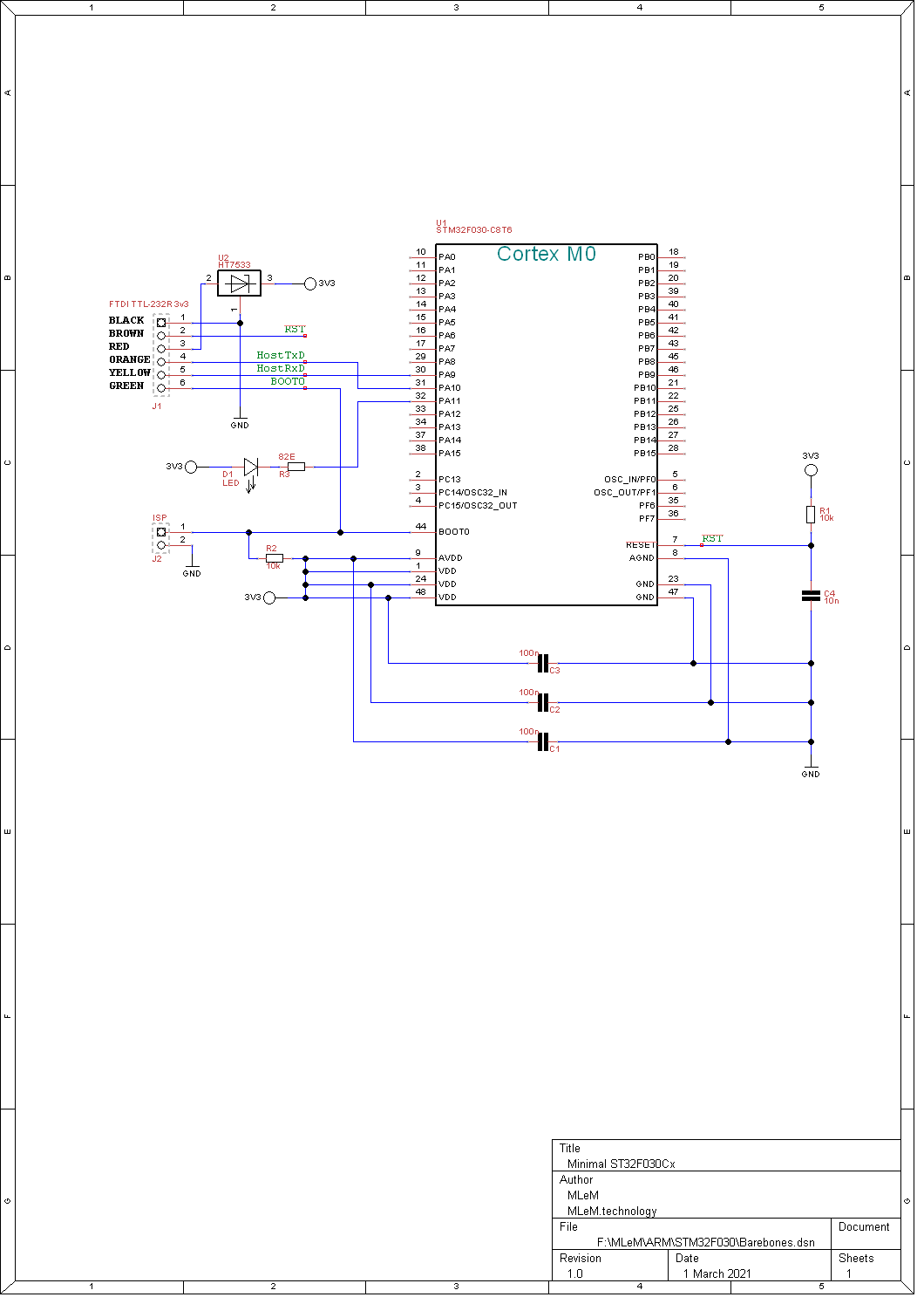 A minimal circuit for the ST STM32F030C8T6 looks like this: